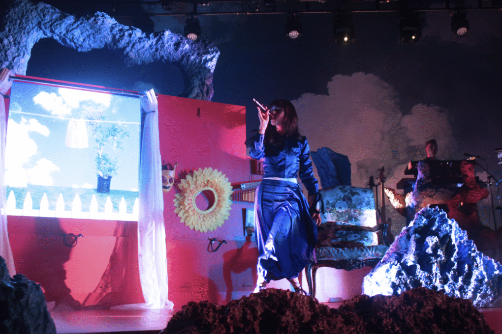 Mica Tenenbaum sings as the stage lights up in shades of red and blue behind her. (Image / Andrea Mejia)
