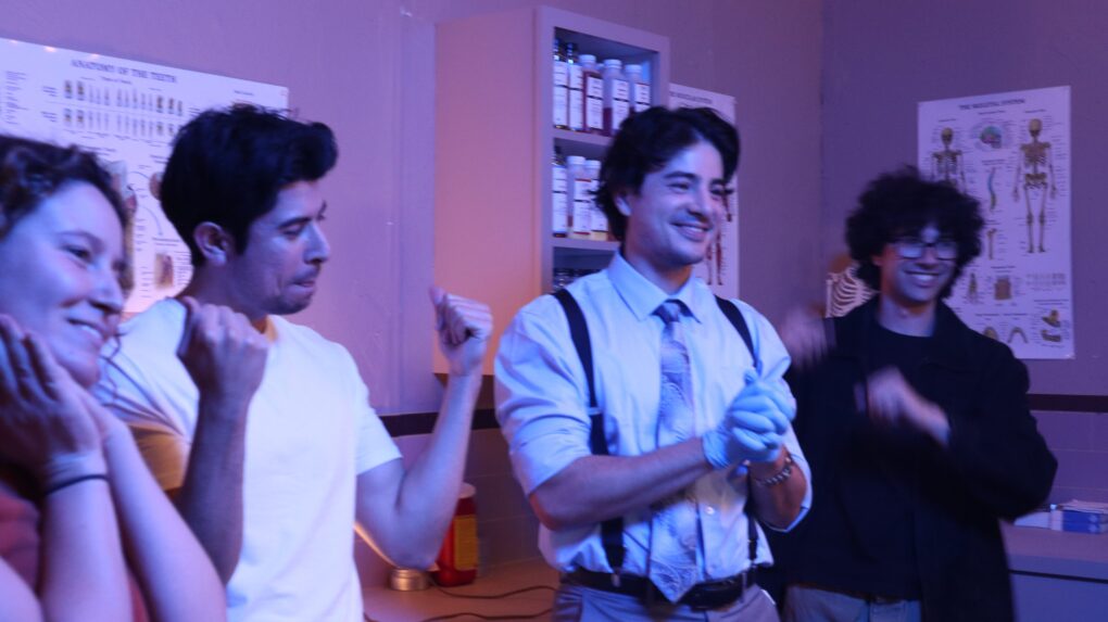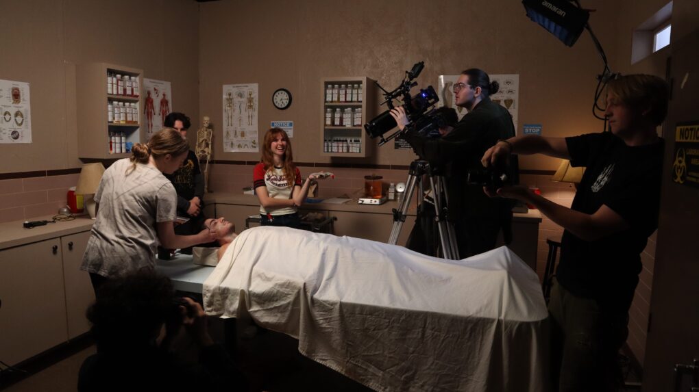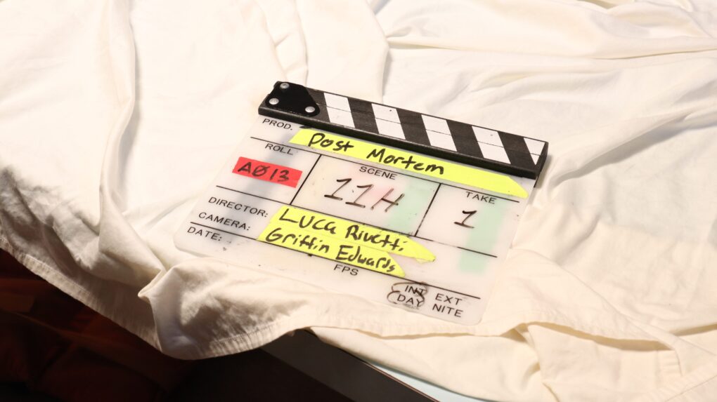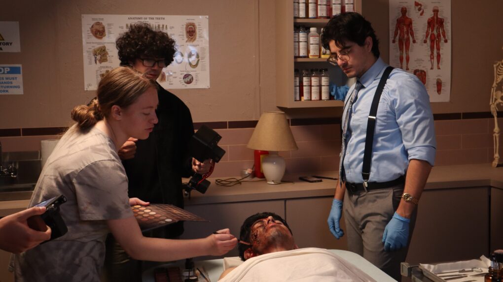 Oct. 26, 2025 marks the fifth and final day of shooting for the TFM 560 student thesis film, “Post Mortem.” Morty, played by Douglas Jung, is a funeral director who can see and talk to dead people. He receives artificial tears in preparation for an emotional day where he battles his own mortality. While centered around death, dying and a question of the afterlife, the crew keeps nothing but a light-hearted and comedic environment on set.Morty and Michael, an old peer Morty works on, rehearse a deep exchange on Michael’s experience with dying in a motorcycle accident. He reflects on the action of “letting go” as “peaceful.”