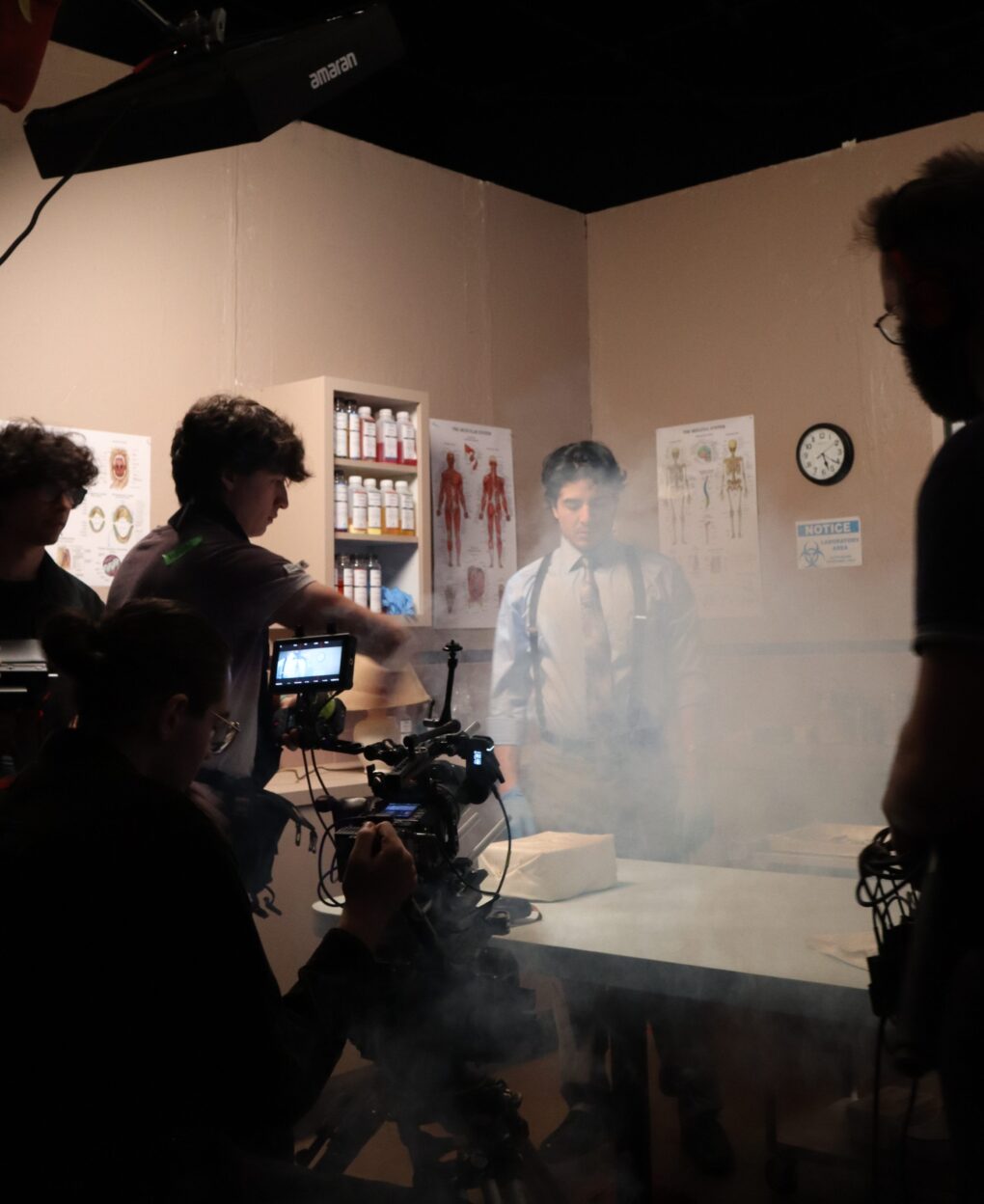 Haze adds a ghostly effect to the set.“That’s a wrap!” After 12 hours on set, filming completes and gratitude fills the air.“Post Mortem” will be submitted for consideration in the San Diego State University’s Emerging Filmmakers Festival showcase on Dec. 15 and 16, 2025.