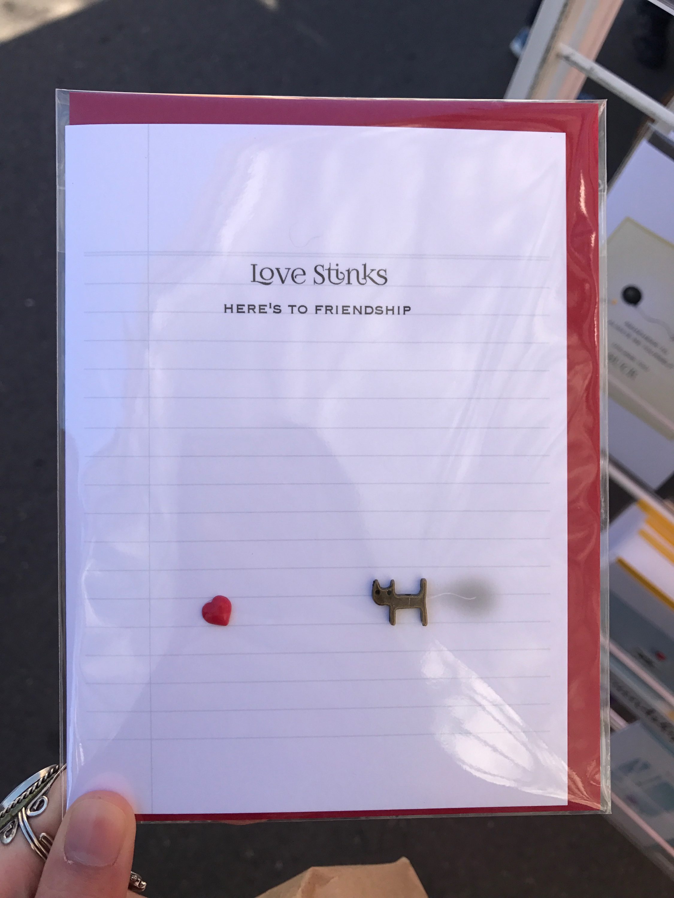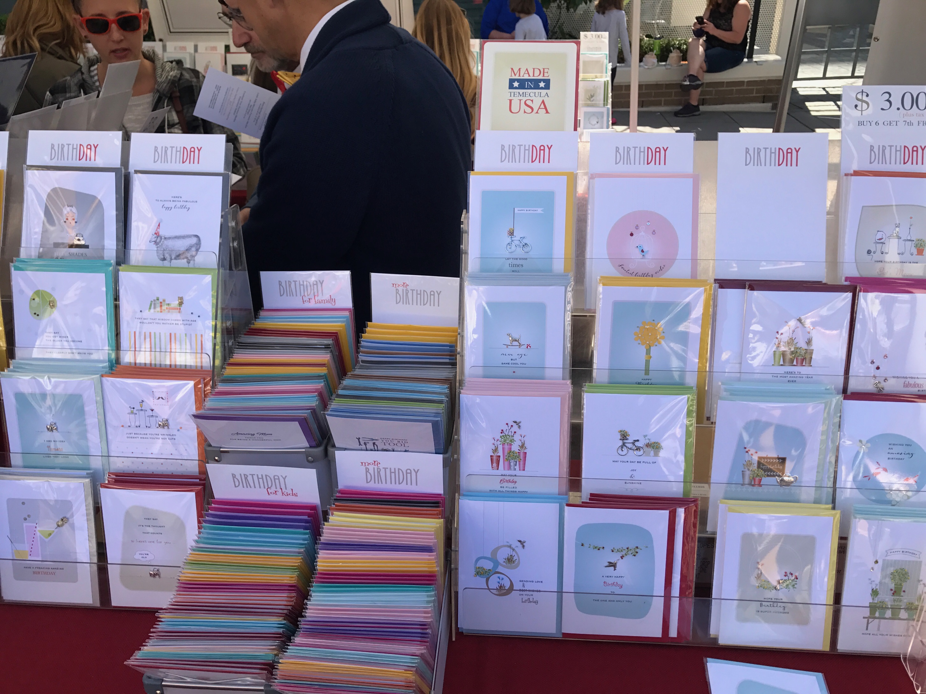 My favorite part about the farmers’ market in Little Italy was the food. I bought chips and guacamole salsa, creme brulee, lemonade with chile and handmade chocolates. There was so much that I didn’t get to eat – which is enough to convince me to go back next weekend! While there were plenty of art and jewelry vendors, I noticed that this market was more art-centric and didn’t sell as much jewelry as the Ocean Beach Farmers’ Market. However, it was interesting to see everyone’s unique artwork. My favorite art vendors were these two men who sold handcrafted cards – they had one for every occasion!
