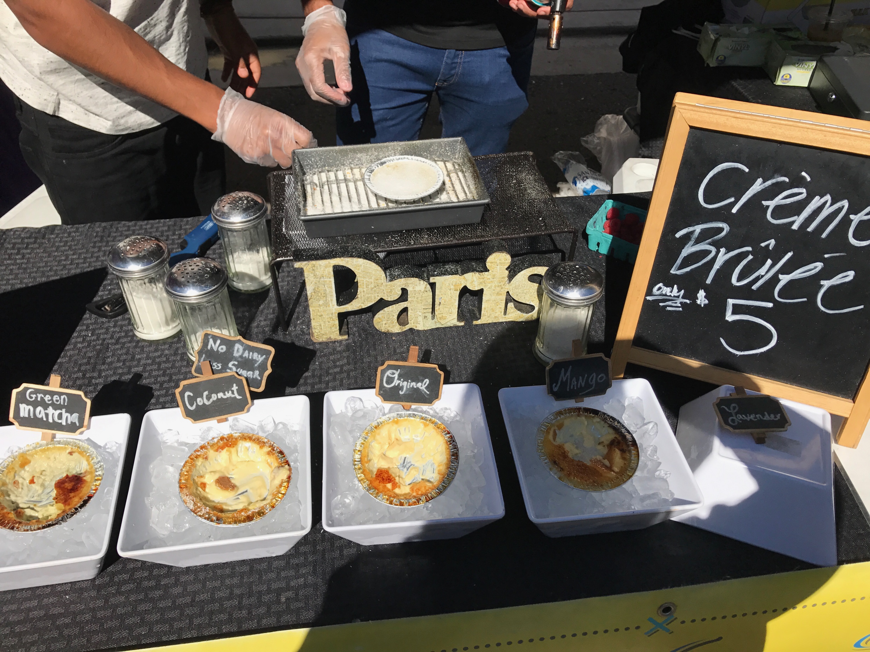I personally preferred the Little Italy Mercato Farmers’ Market over the Ocean Beach Farmers’ Market. This market was bigger and had a wider variety of foods, drinks and desserts. Because it was on a weekend morning, there were more people and families walking around, which made it very lively. I did see a few of the same food vendors from Ocean Beach, but this farmers’ market seemed to have a lot less restaurant-style vendors and a lot more specialized vendors. Specialized booths served a variety of things such as chocolates, beef jerky, creme brulee, hot sauces, guacamole, paninis and crepes. This market stretched over a few blocks, so there was more to see, eat and buy (which was a hazard for my wallet).