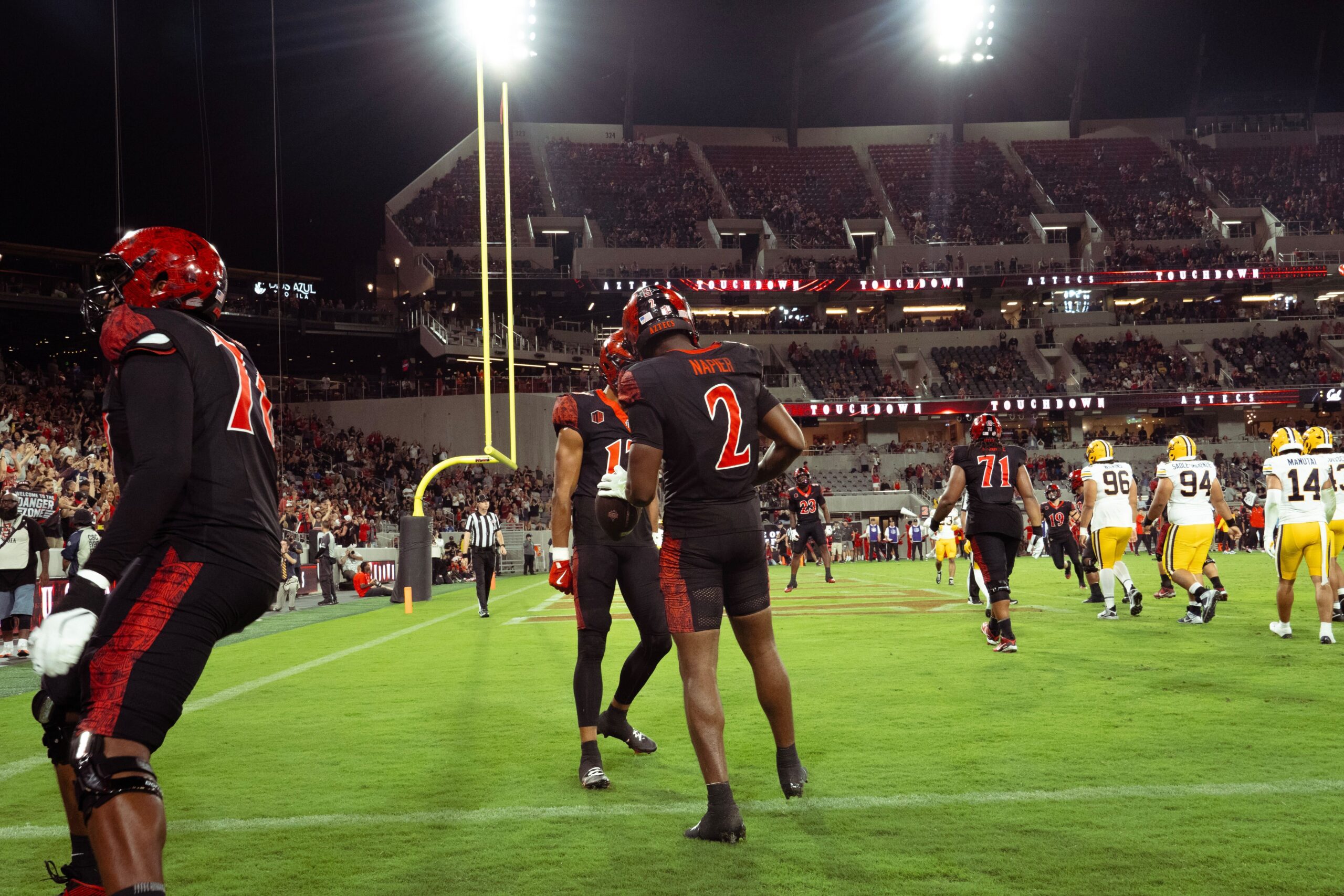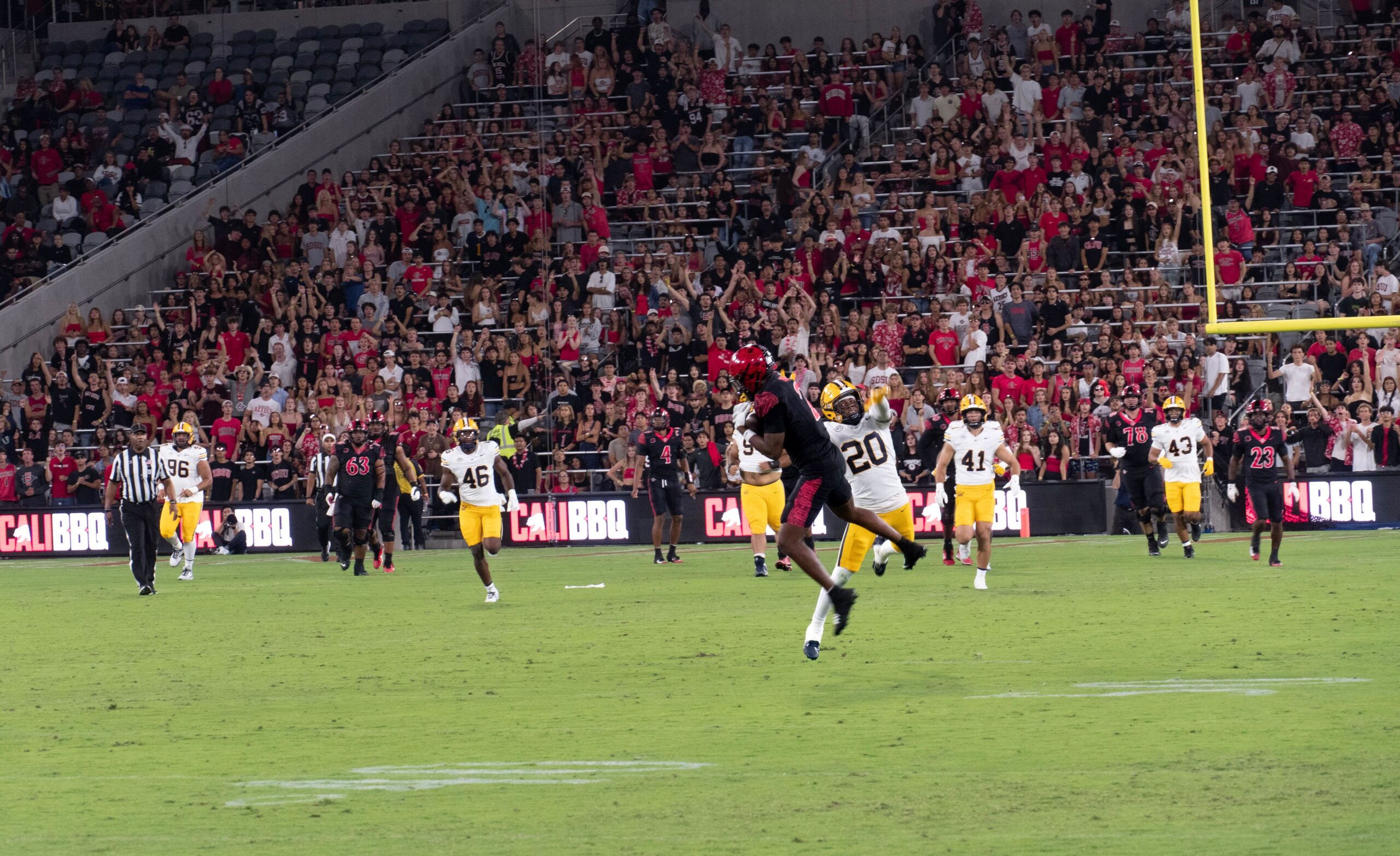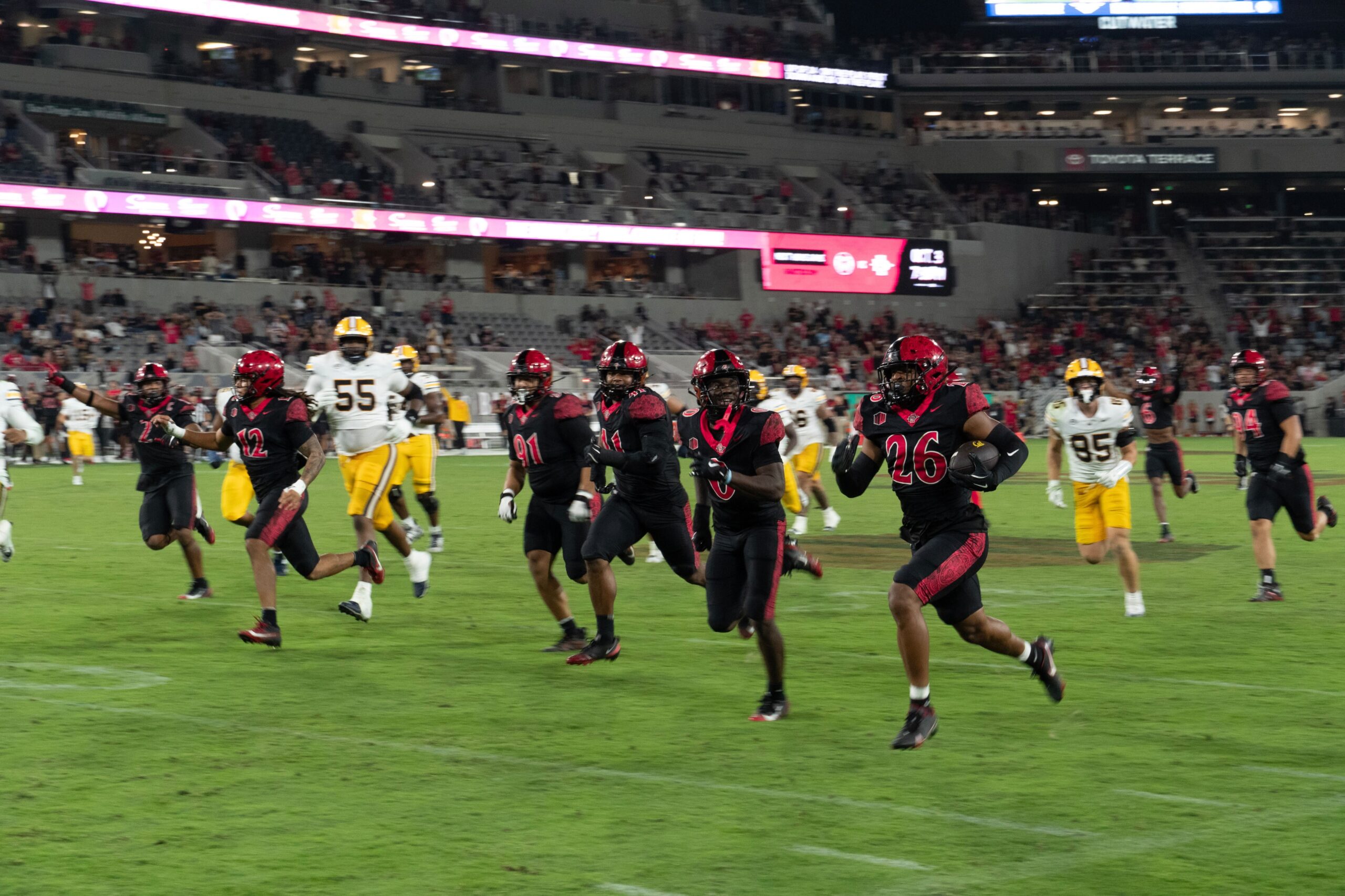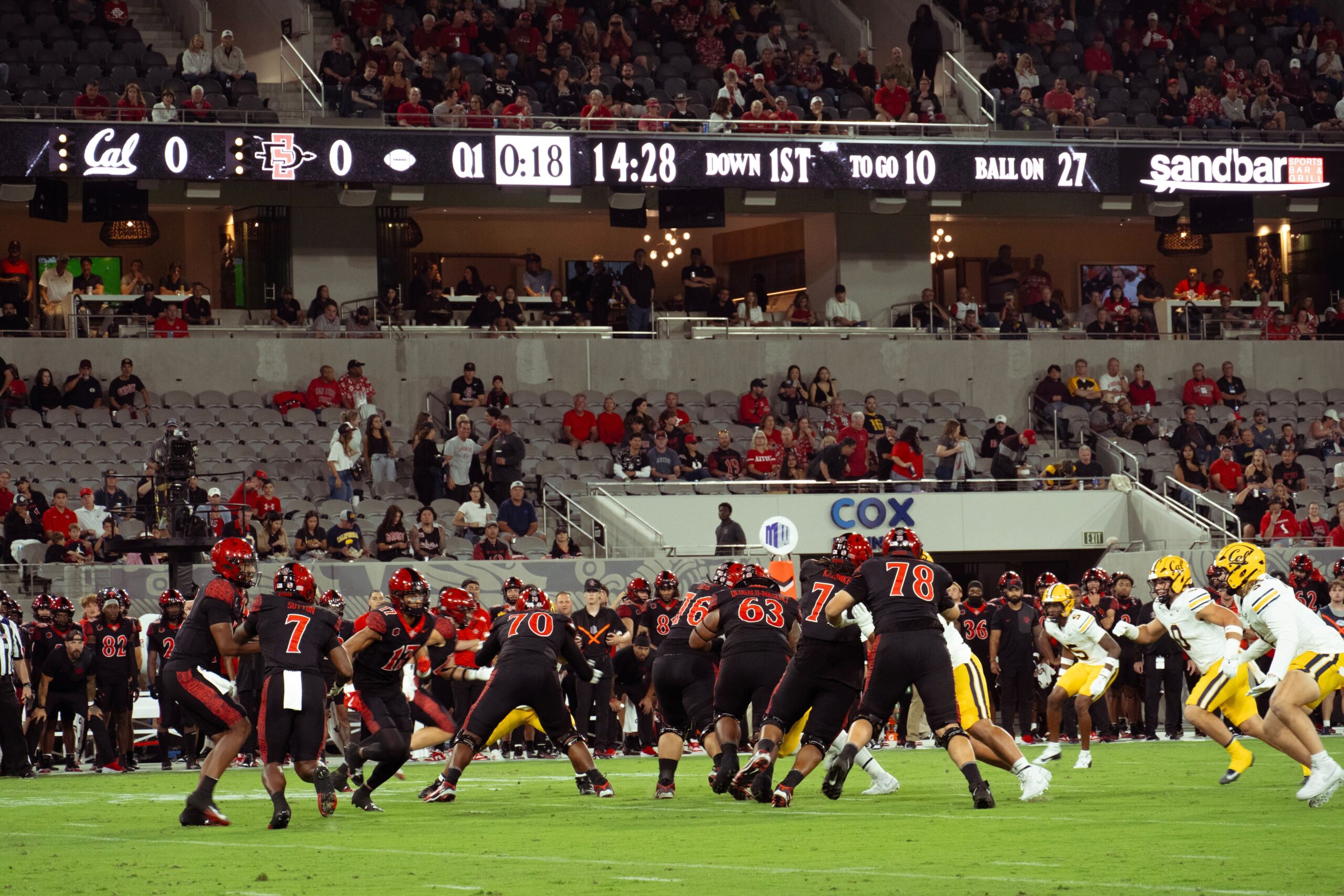 The San Diego State football team shocked the world when they stunned the Cal State Golden Bears in a 34-0 win on Saturday night at Snapdragon Stadium. Here are some photos from the game captioned by one of KCR Sport’s photographers, Brianna Marbella.