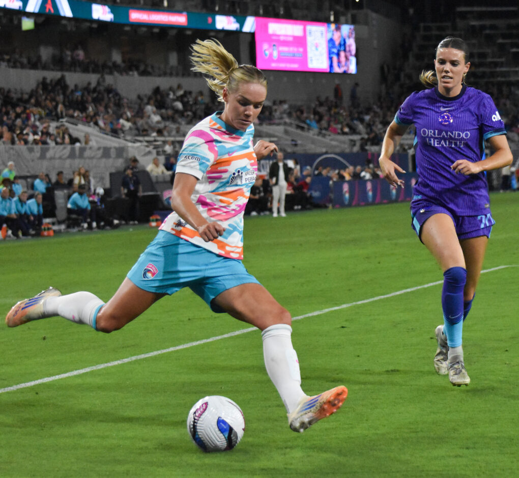 Hanna Lundkvist (6) runs down the endline, kicks, and passes to a fellow teammate in an attempt to score. Pride forward Julie Doyle (20) fails to intercept the pass on defense.