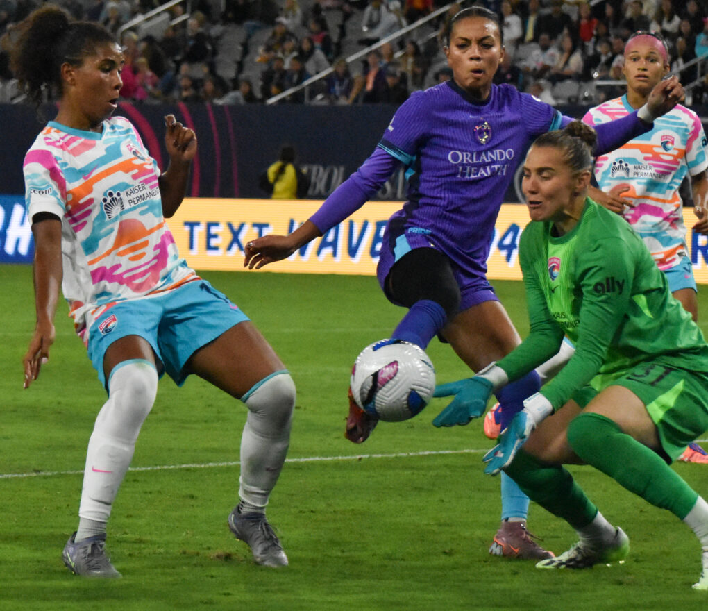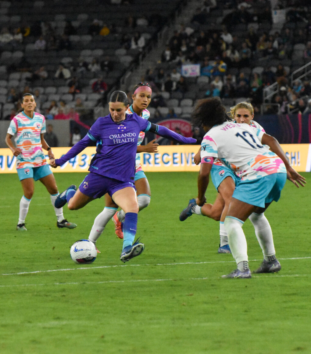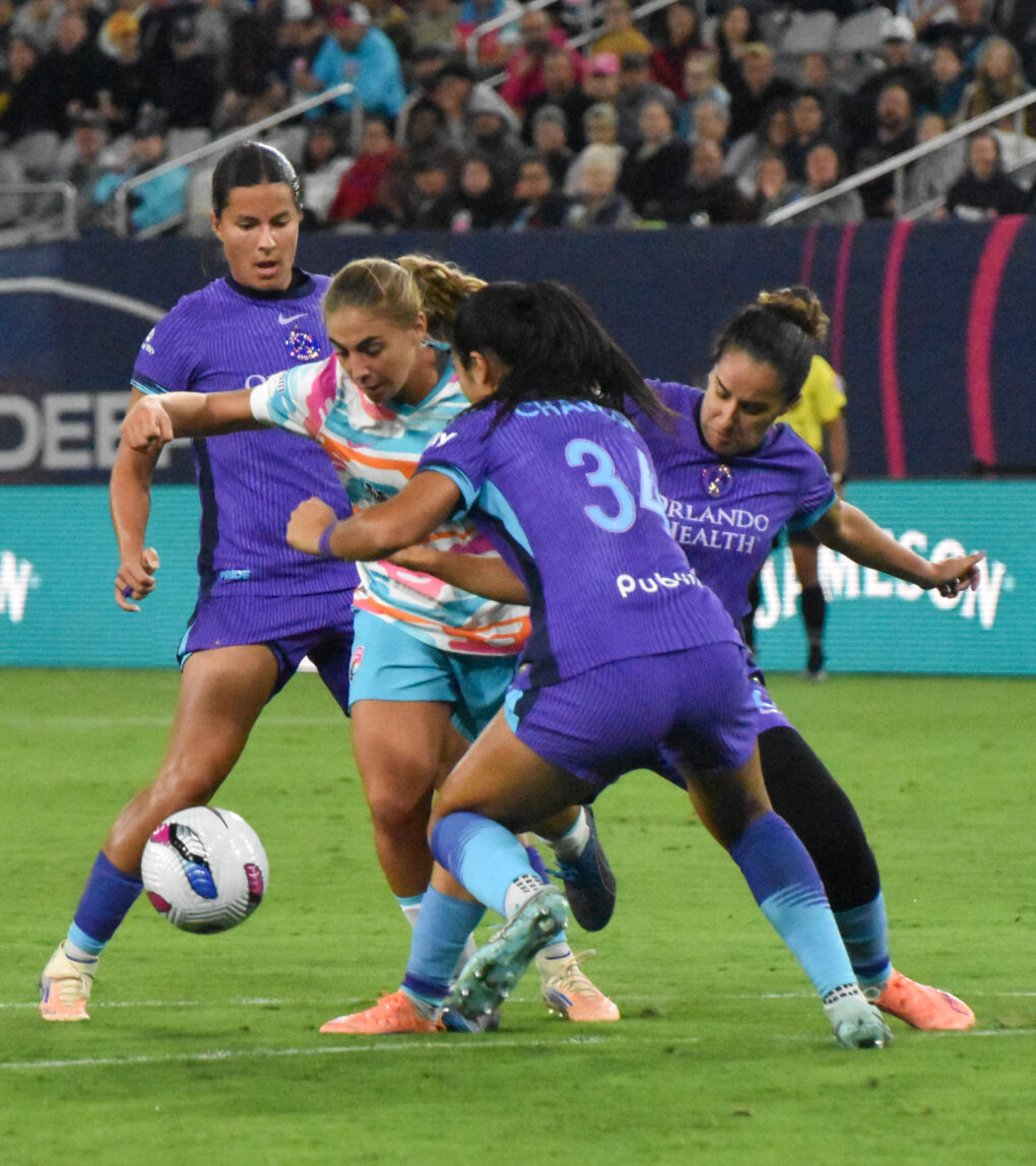 SD Wave midfielder Kimmi Ascanio (17) competes against three Orlando Pride defenders in order to maintain possession of the ball.