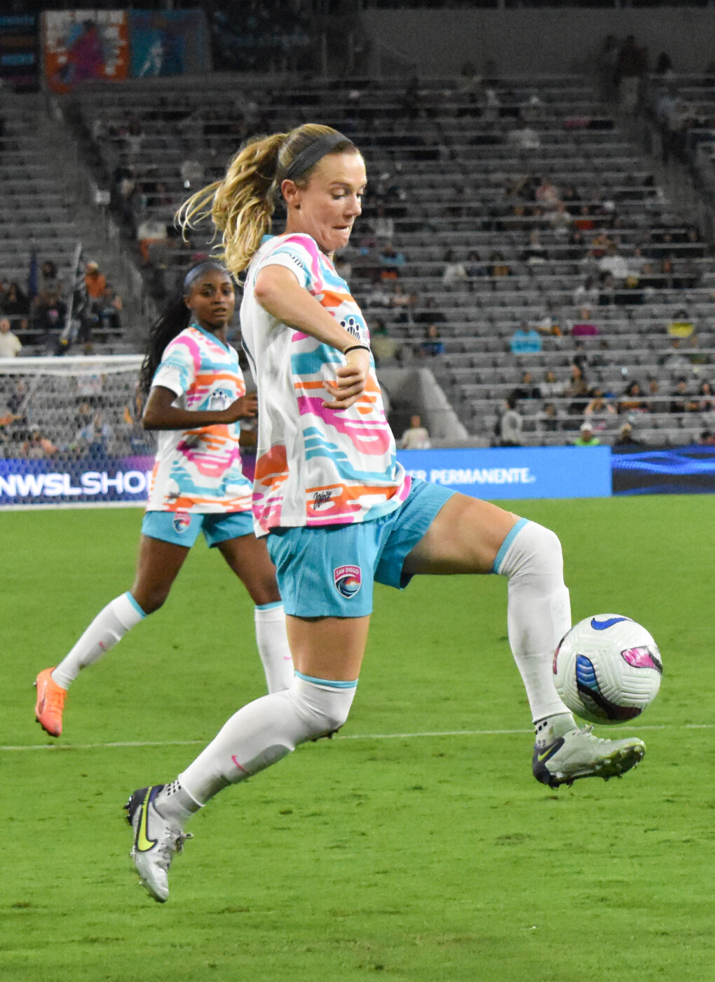 Entering the second half, the score is tied 1-1. Pride midfielder Haley McCutcheon (2) shoots the ball past Kenndey Wesly (12) . However, the Wave gains possession as Haračić intercepts the ball before reaching the net.