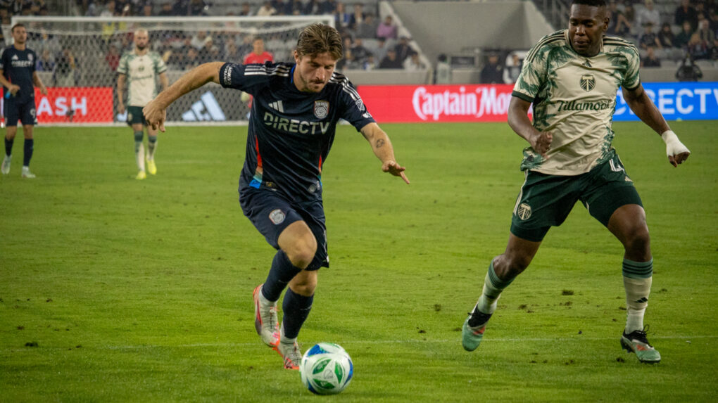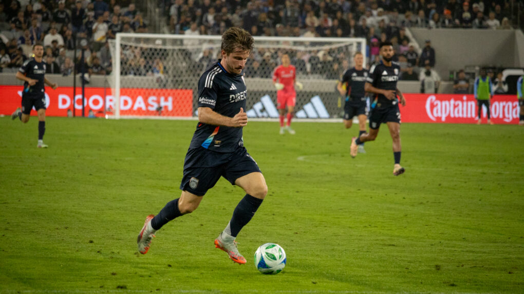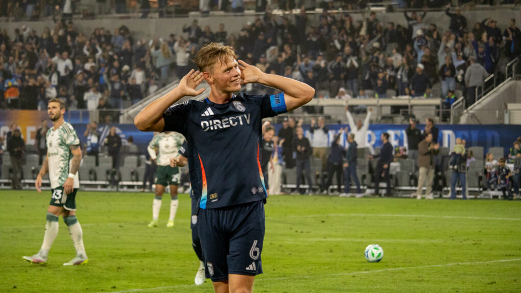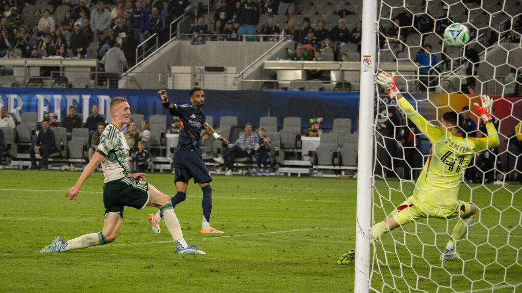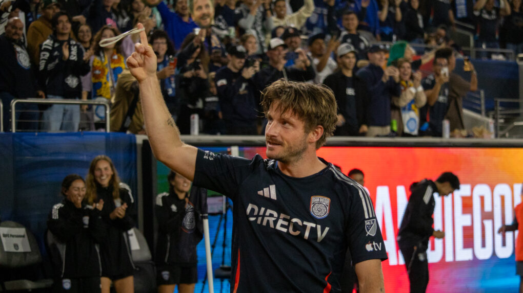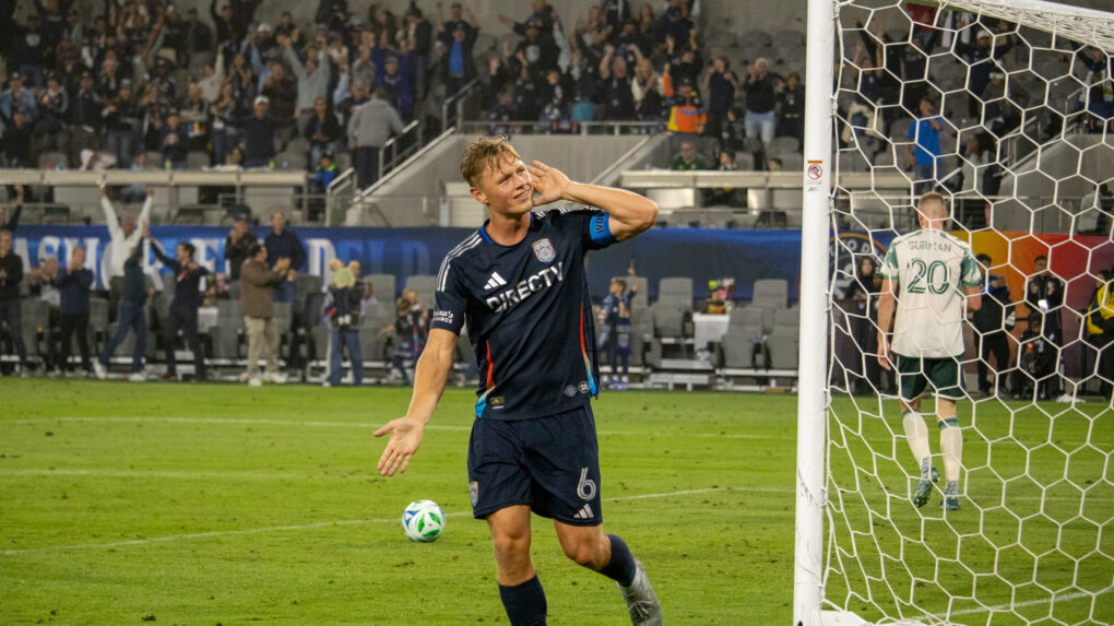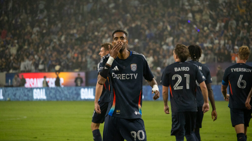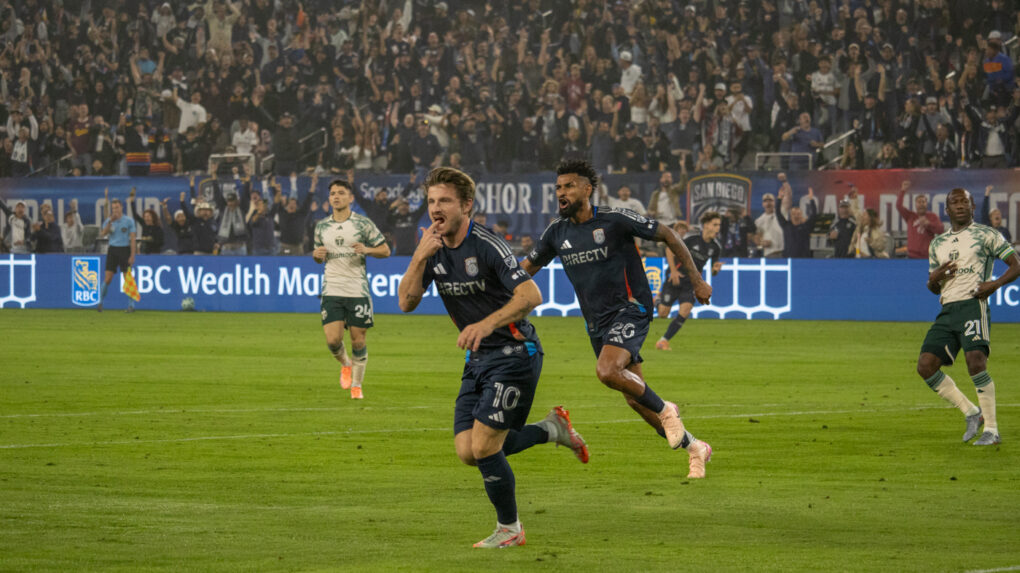 The striker curls a perfect shot toward the top corner, sending the ball past the diving keeper. The crowd erupts as San Diego extends their lead.