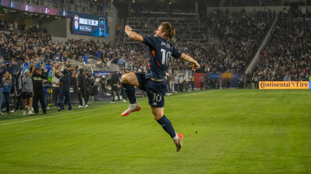 A San Diego player celebrates after scoring a goal, sprinting with excitement as the crowd roars behind him. His teammate follows close, sharing the moment of triumph.