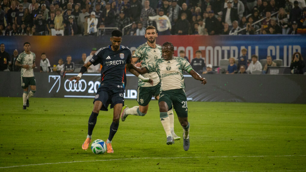 Two players battle for possession in front of the packed stands. The San Diego forward fights off defenders to push the ball toward goal.