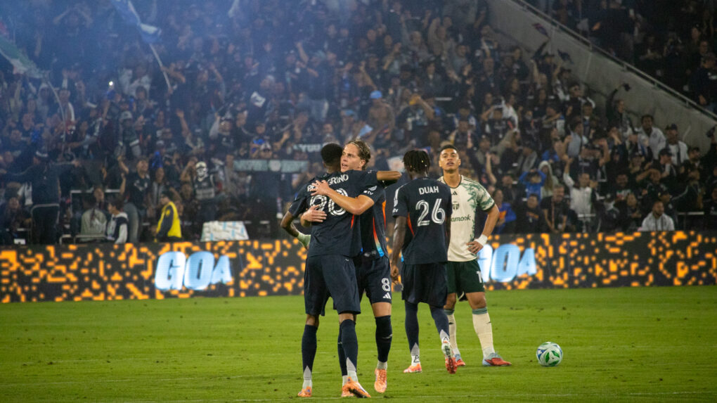 Two teammates share a hug after a crucial goal. The stadium is buzzing as their connection fuels San Diego’s momentum.